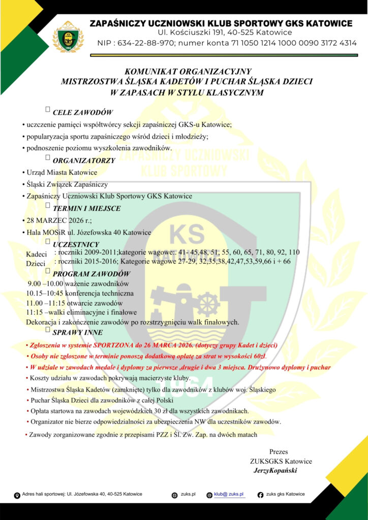 28 marca 2026 r. w Hali MOSiR przy ul. Józefowskiej 40 w Katowicach odbyły się Mistrzostwa Śląska Kadetów oraz Puchar Śląska Dzieci w zapasach w stylu klasycznym.